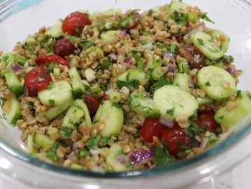 Wheat berries, onion, tomato, garlic, cucumber, herbs