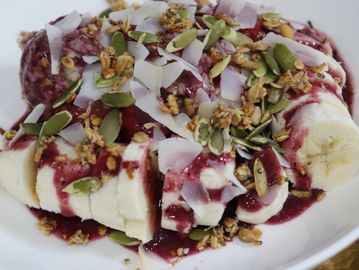 This the perfect breakfast! Cooked soaked oats, sweetened with honey, added banana and berries, covered with shredded coconut. You will enjoy this!